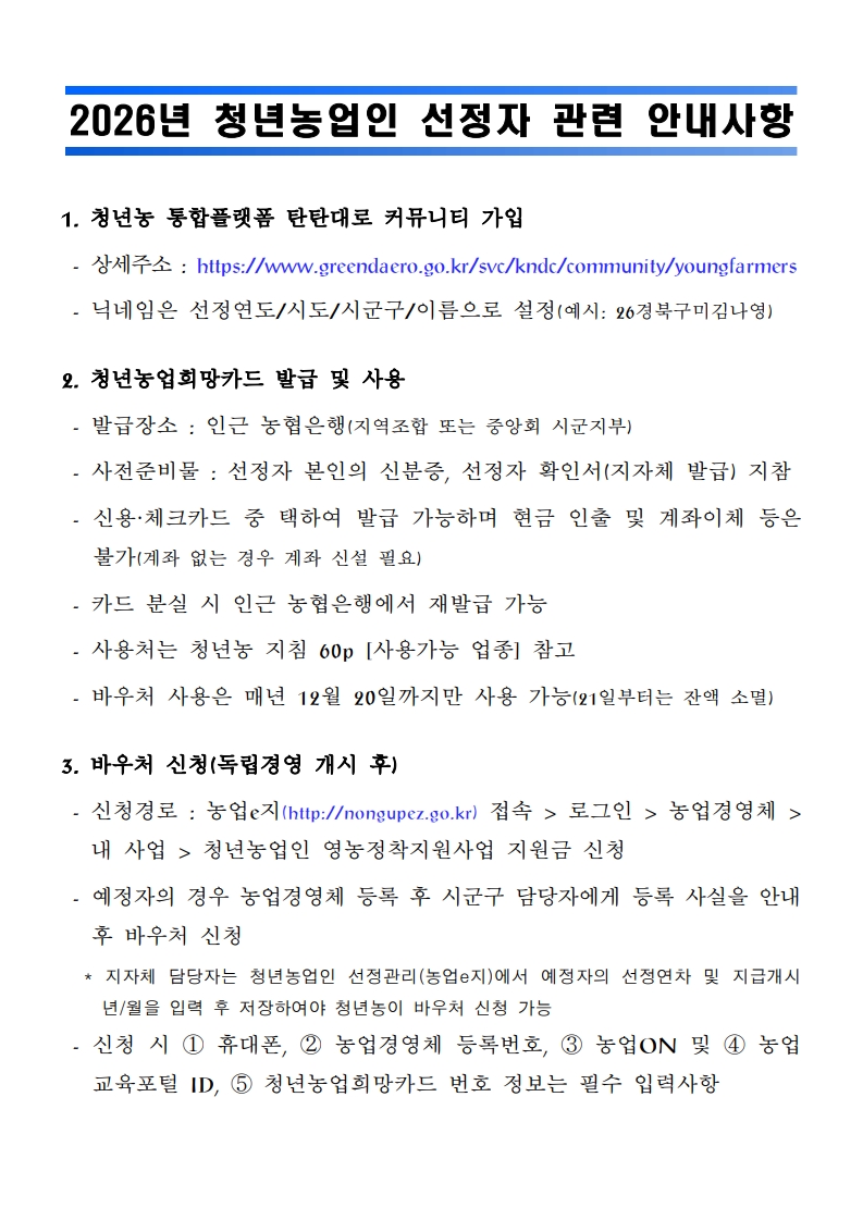 2026년 청년농업인 영농정착지원사업 선정자 관련 안내사항 알림